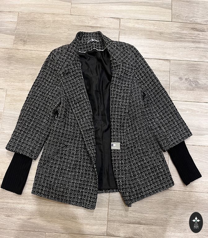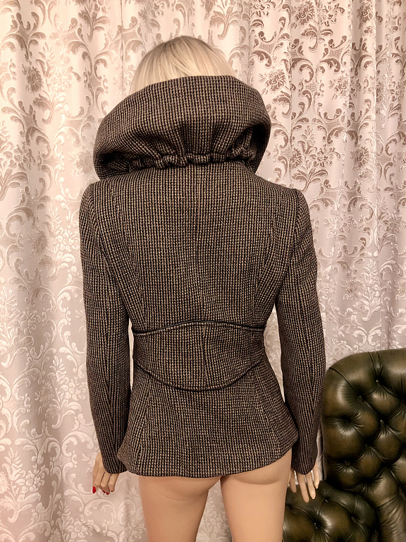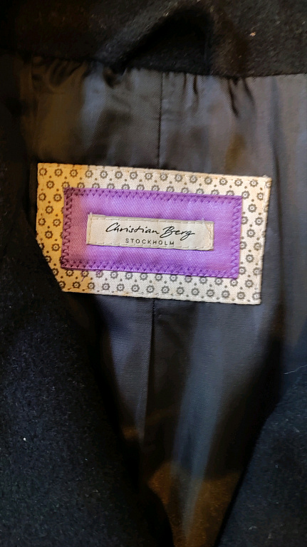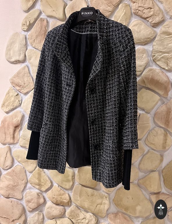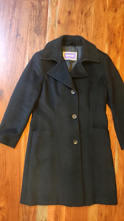 Etiketėje nurodytas dydis uk12, eu40, tai maždaug S-M. Audinys aukštos kokybės, tankus, gerai išlaiko formą. Pečių plotis 41 cm, krūtinės plotis 47 cm, liemens plotis 42 cm, klubų plotis 49-50 cm. Rankovės ilgis 61 cm, ilgis 93 cm.