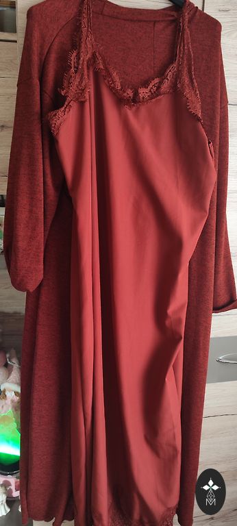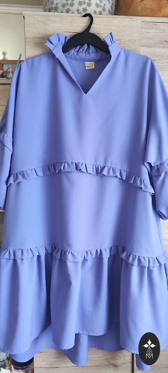 Bieza auduma. Izskatās ļoti skaisti. Krūtis 116, garums 88-95, gurni 120. Nestiepjas.