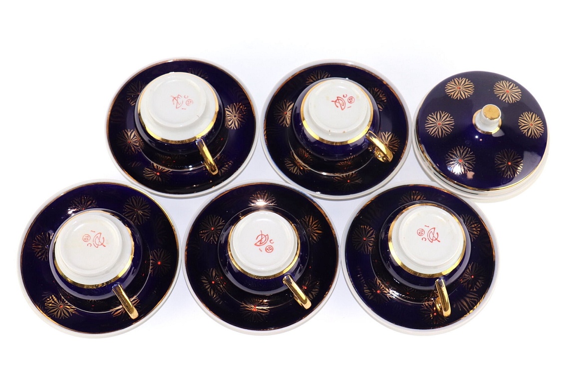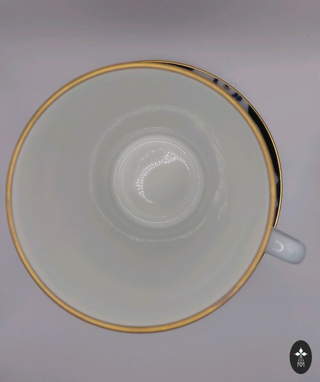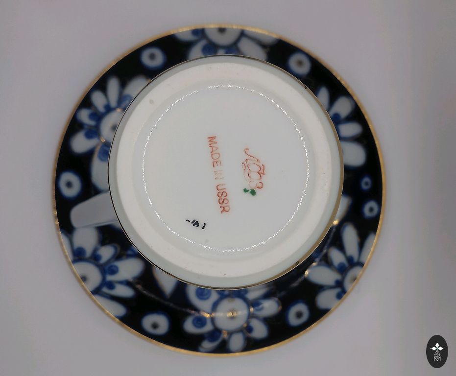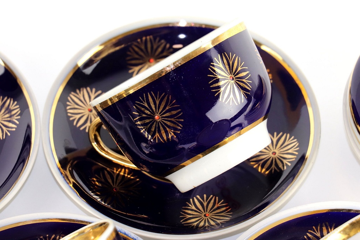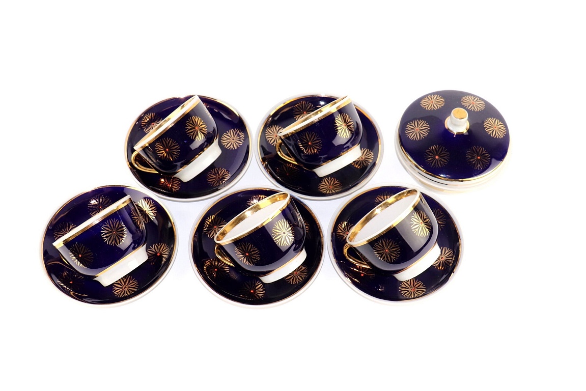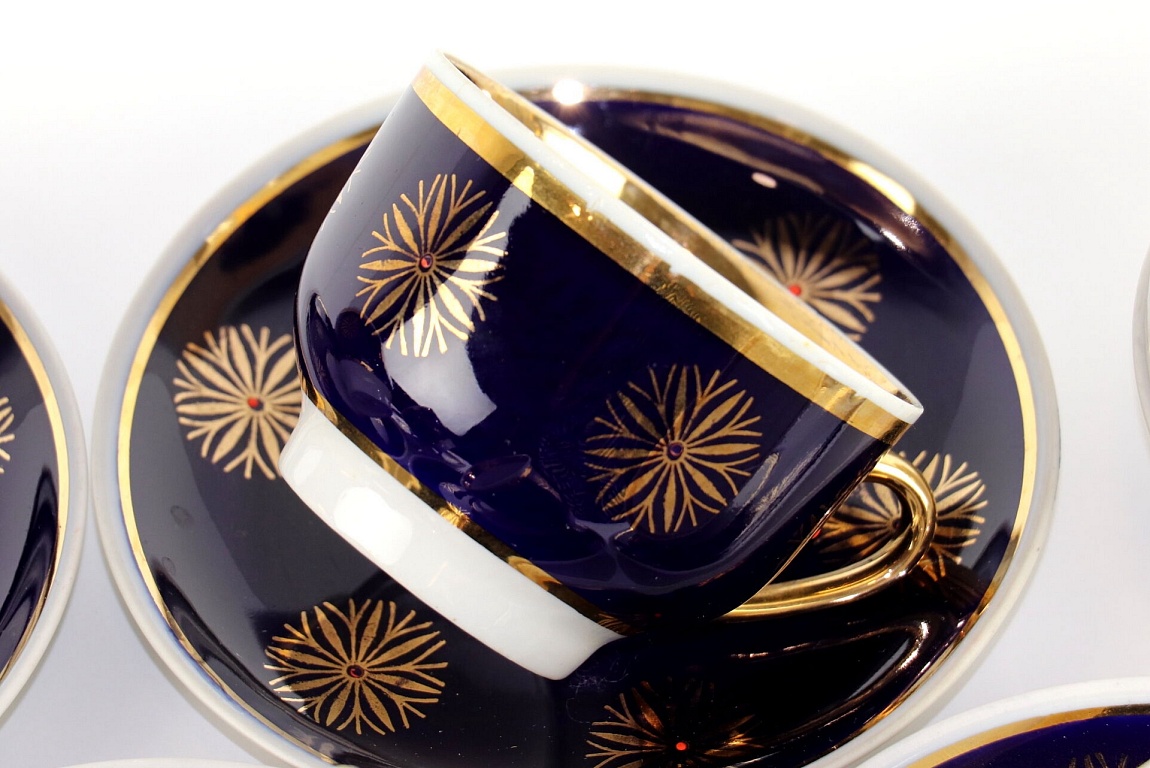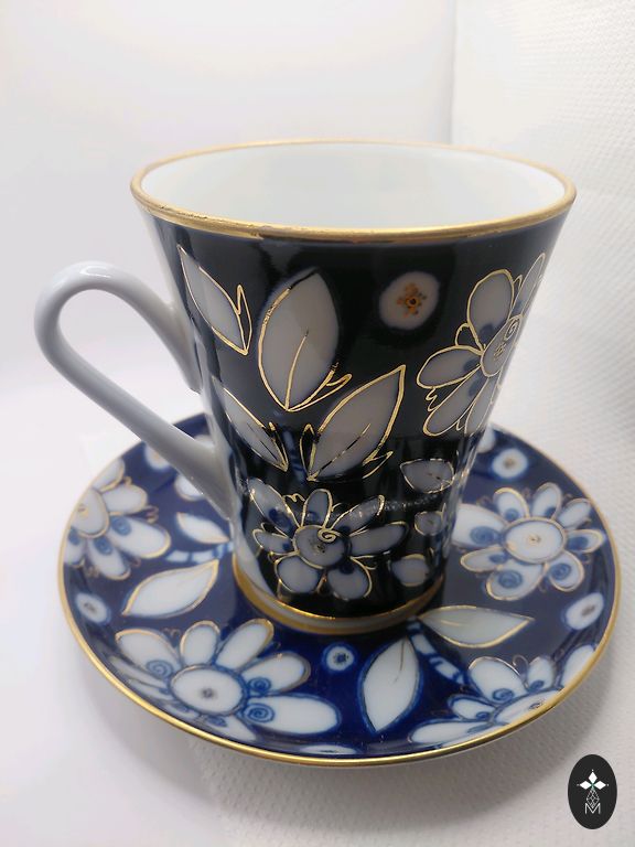 A pair, a teapot, and a mug. Both have a capacity of about 250 ml. The mug and the teapot lid have a very beautiful cobalt color. The pictures were taken under artificial lighting, and the true color, real cobalt, is not visible. The material is quite thick. The diameter of the mug is 12 cm.