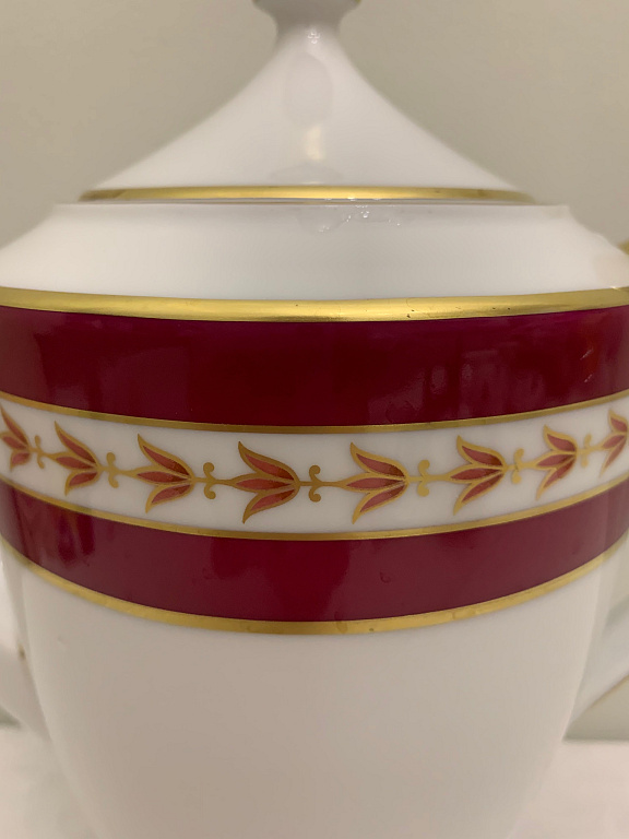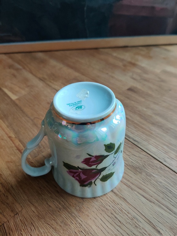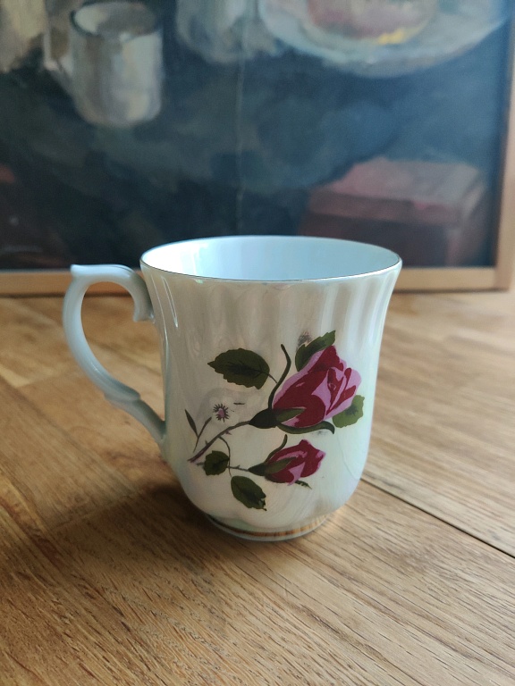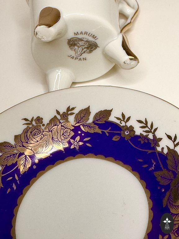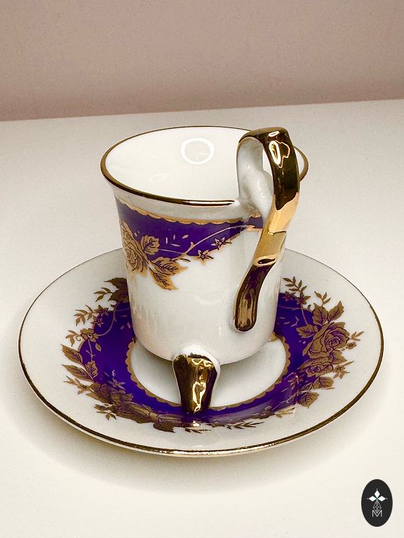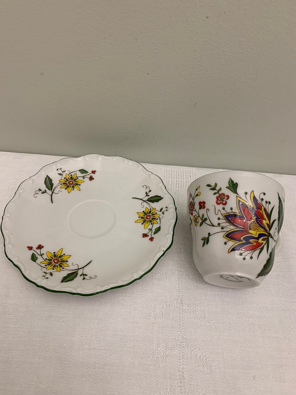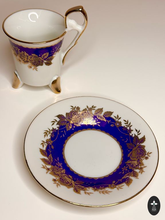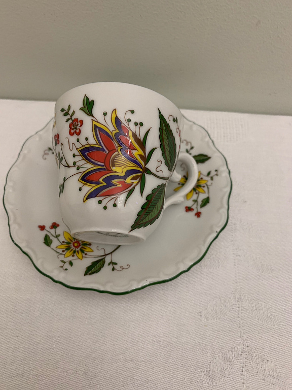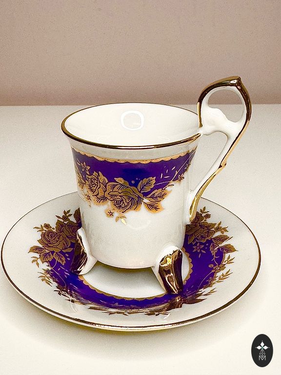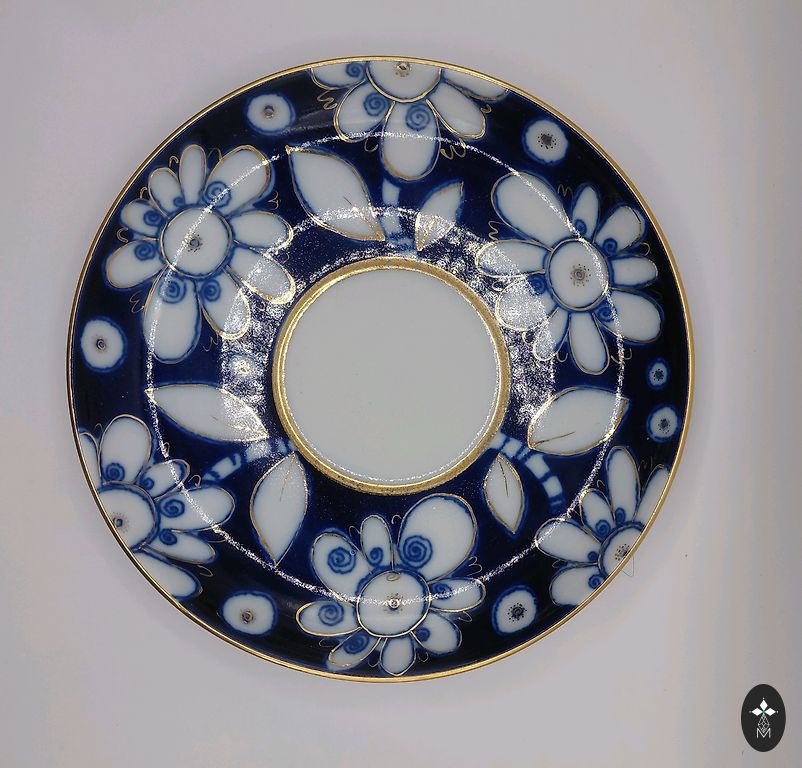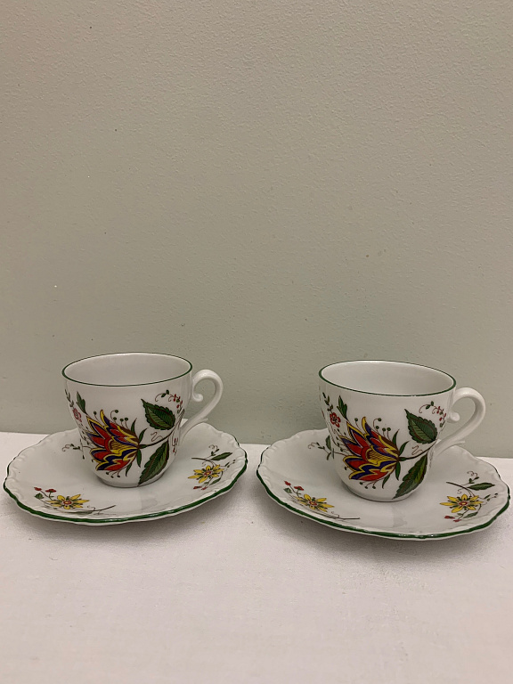 A pair, a teapot, and a mug. Both have a capacity of about 250 ml. The mug and the teapot lid have a very beautiful cobalt color. The pictures were taken under artificial lighting, and the true color, real cobalt, is not visible. The material is quite thick. The diameter of the mug is 12 cm.