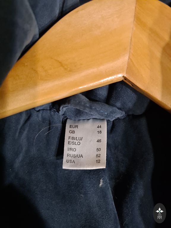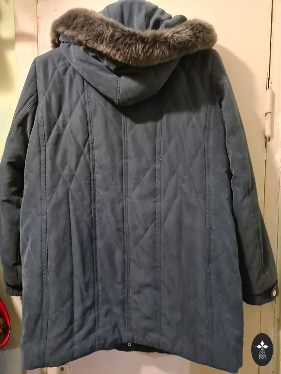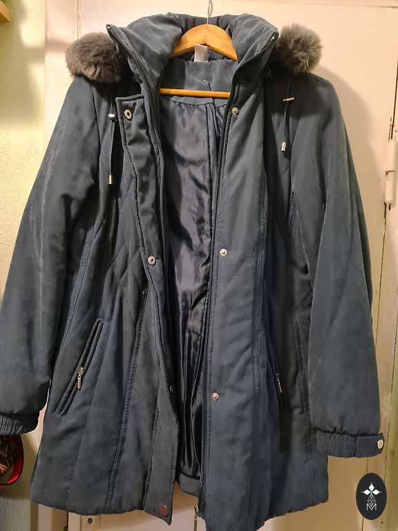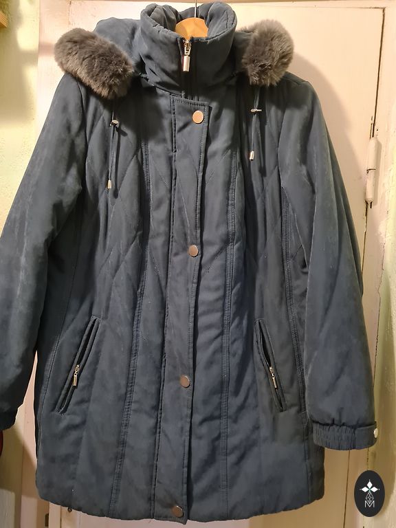 Šviesiai pilkas vėjjakas, išryškinantis figūrą, su įdomiu gobtuvu. Dydžiai (cm) - 106-92-112, pečių plotis 42, švarko ilgis 64, rankovės ilgis 61.