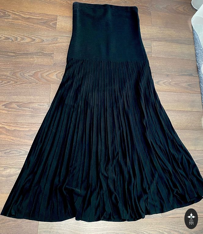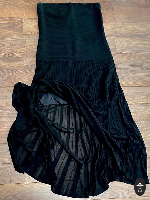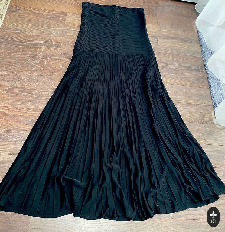 Suknelė su ilgu diržu ir skeltu maždaug iki kelio, kai ūgis yra 1,70 m