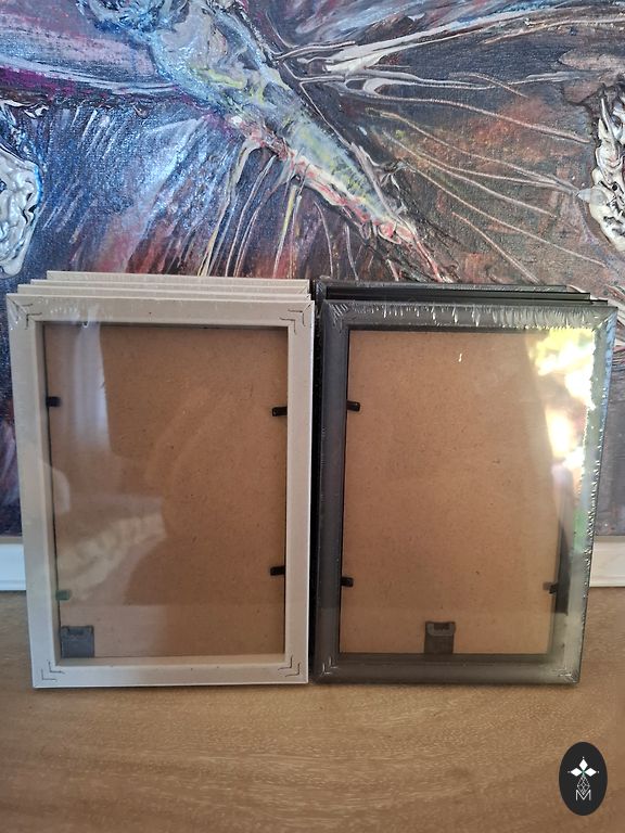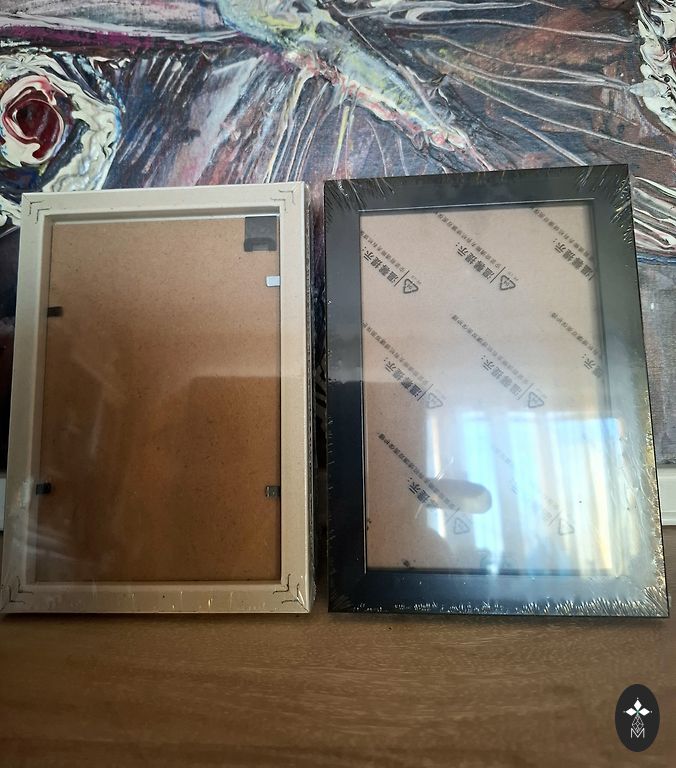 Medinis rėmas aukso patinos spalvos, paveikslas uždengtas stiklu, paspartū išpjova 27x18,5 cm, rėmo išorinis dydis 49,5x42 cm.