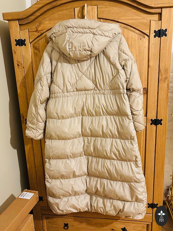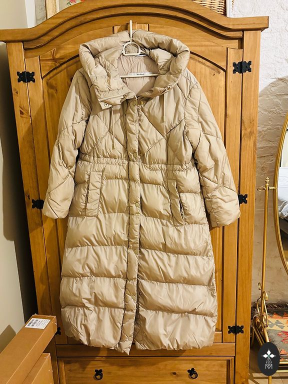 Plotis po pažastimis yra 52 cm (x2), rankovių ilgis nuo peties siūlės yra 67 cm. Užpildas yra tikros pūkai ir plunksnos. Siuntimą per paštomatą apmoka pirkėjas.