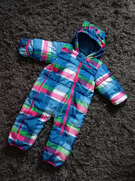 Sitting in a warm stroller bag, you can dress even in winter. The only drawback - lost booties and cuffs are no longer bright pink. I liked that the jumpsuit wasn't big and puffy because my daughter is slim.