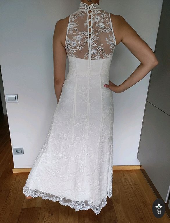 Õhuline pulmakleit, mis on eriline oma lihtsuses. Lõpuks ma seda kleiti teisel päeval ei kandnud, seega on see kasutamata, ainus viga on väike defekt seljal, kuid seda saab kergesti parandada, kohandades kleiti kehale. Foto, millel defekt on näha, on lisatud. Kleit sobib suurusele S või M.