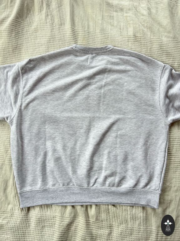 Pilka mėlyna medvilninė megztinė.