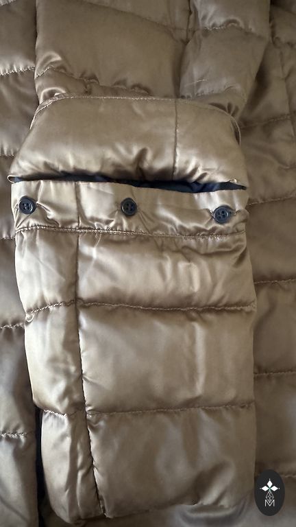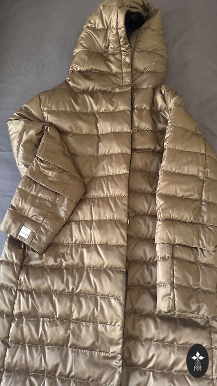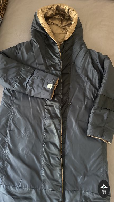 Graži žalios spalvos, dėvimas iš abiejų pusių, šilta kapišonas, kišenės su užtrauktuku, ilgis 104 cm, rankovės 62 cm, apimtis 108-110 cm, dydis stabilus L.