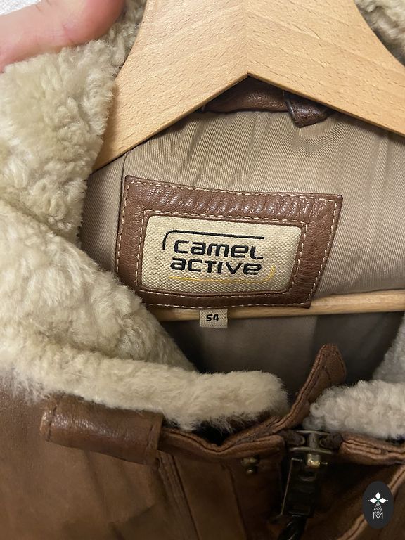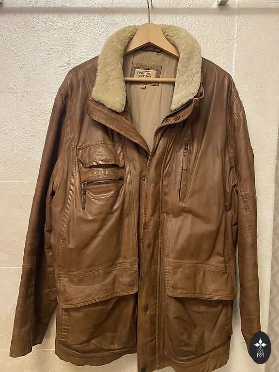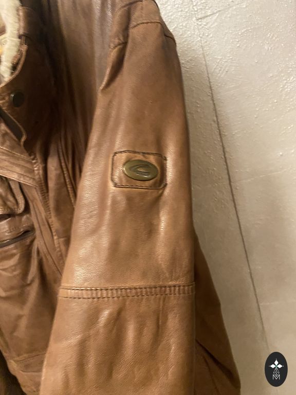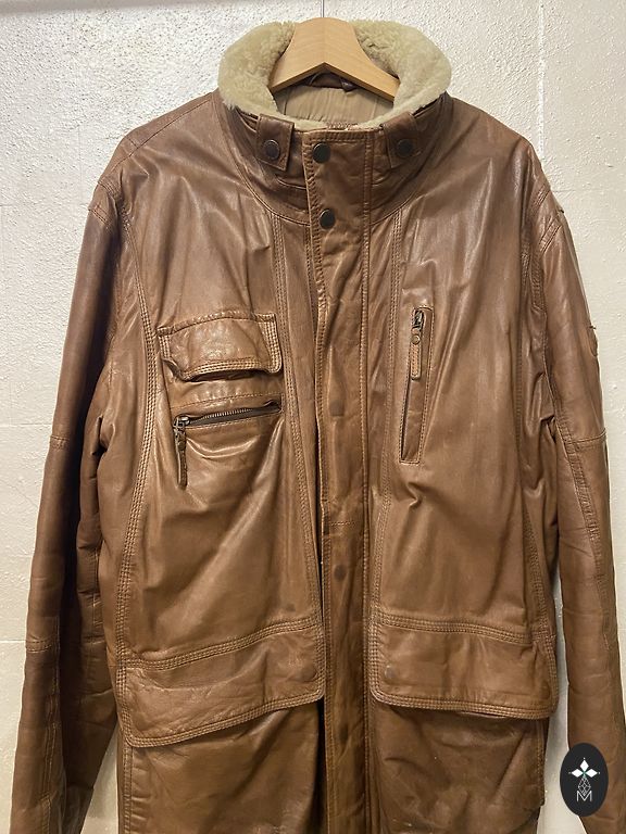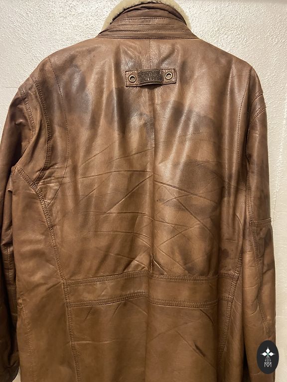 Thick leather jacket with cotton lining. The lining is also thick, without additional insulation. The jacket has an artificially created aging effect.
