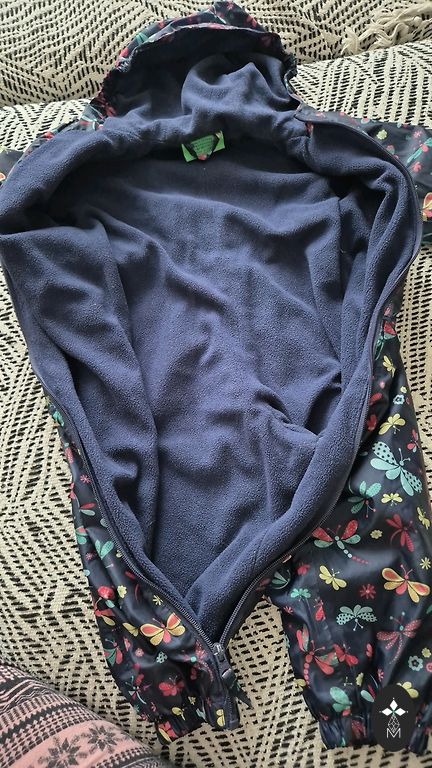Mīksts, flīsīgs kombis uz 80.izmēru, bet der arī lielākam, jo ir diezgan plats. Kājas un rokas vaļējas.