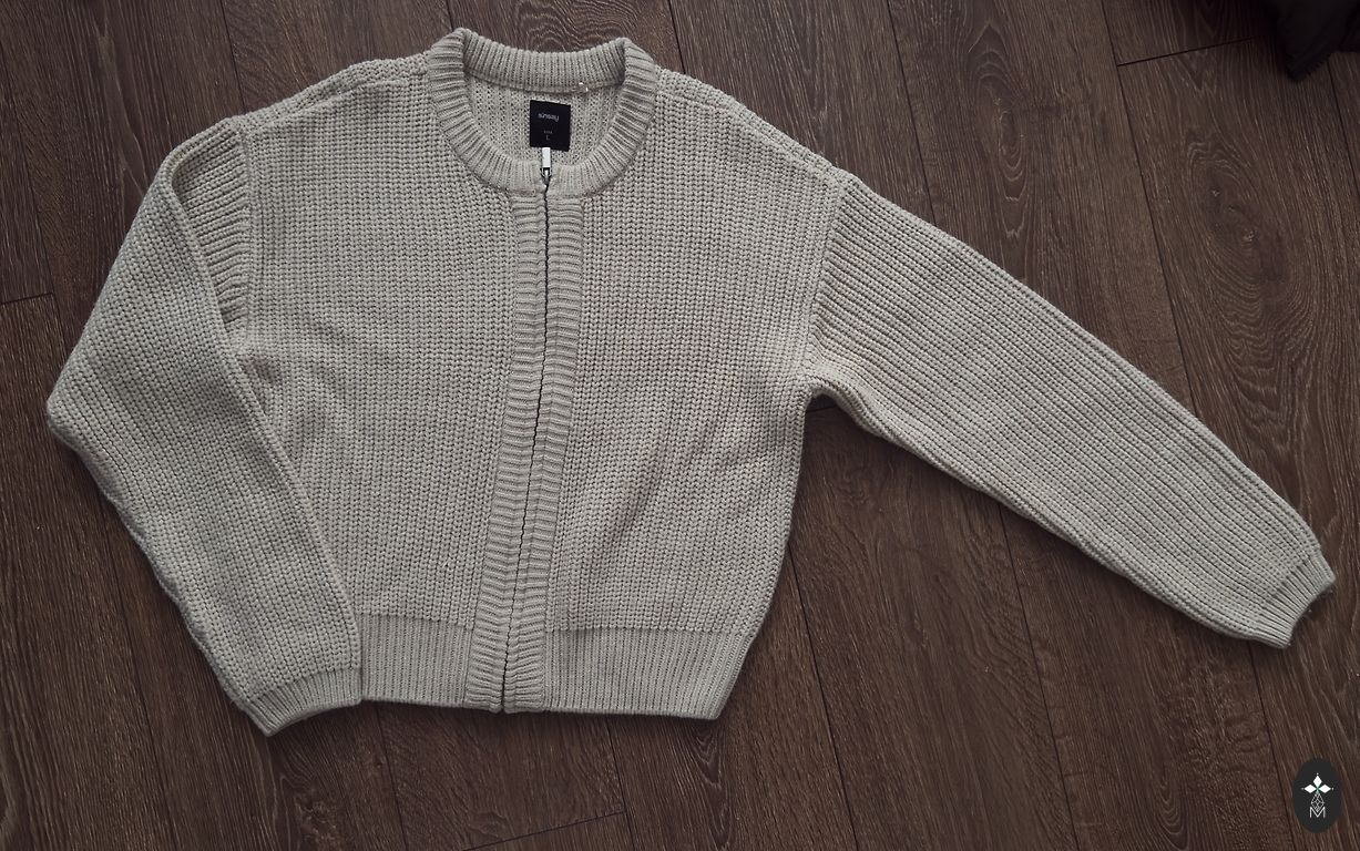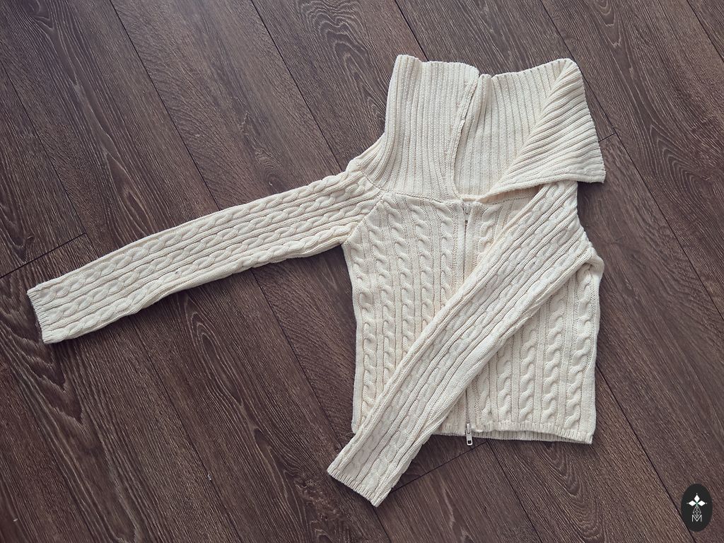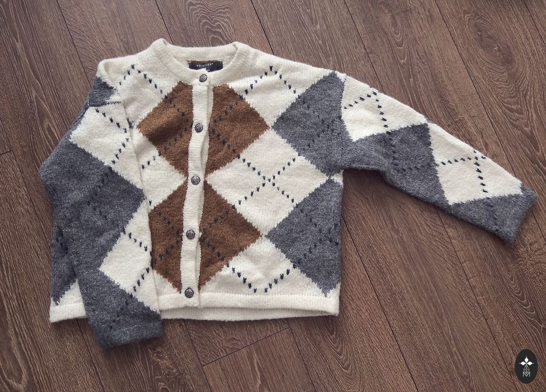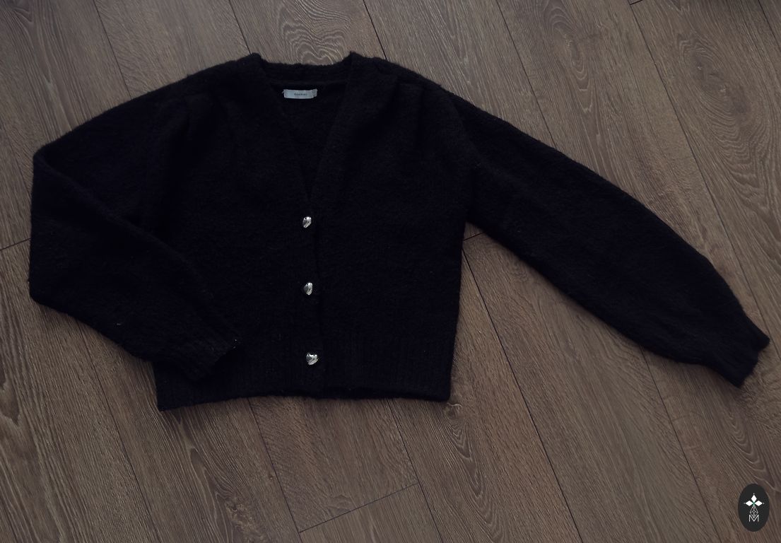 The material composition is 30% wool, 70% acrylic. The cardigan length is 49 cm.