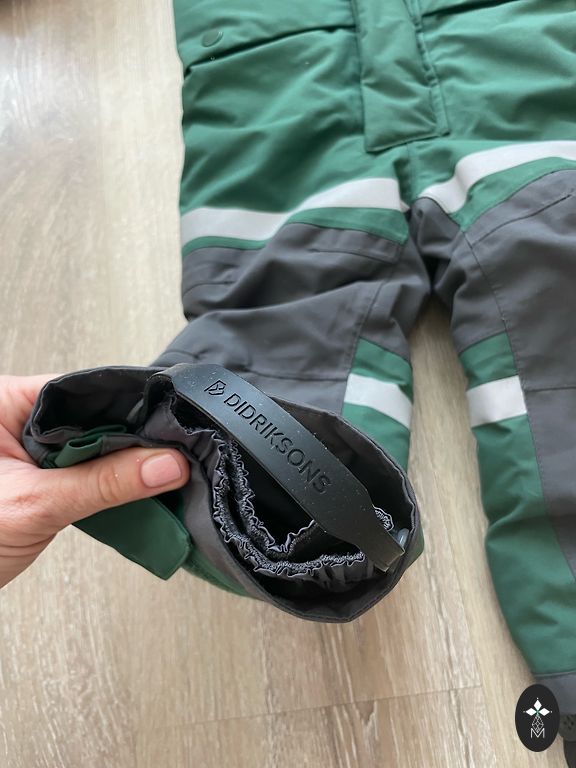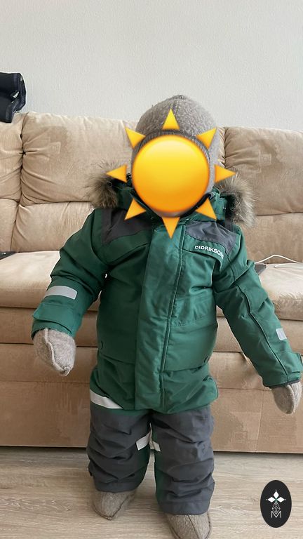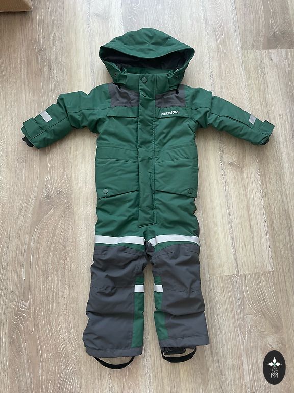 Didriksons overall 100cm + spare overall. Not thick, suitable for transitional seasons. Total length from shoulder to end of leg 90cm. Fabric in very good condition, but there are signs of use on the reflectors, see photos 2-4 specially taken with flash to show reflector defects.