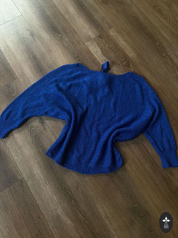 Beveik naujas megztinis, be defektų, tamsiai mėlynas, tamprus ir minkštas, S dydis, nėra storas, krūtinė iki 92 cm, ilgis apie 63 cm.