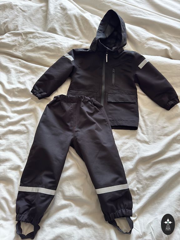 Mėlynas kombinezonas skirtas lietingam orui, yra gumuotas, be šiltinimo.