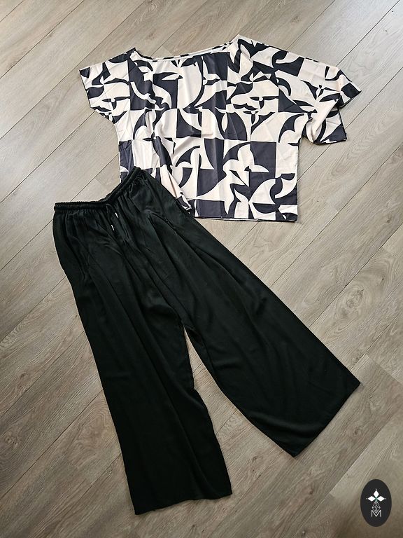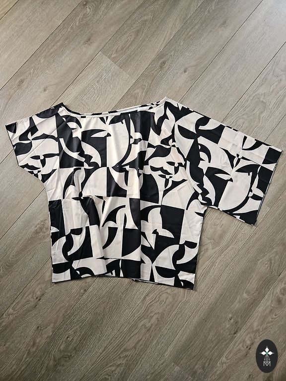 Izmērs L vai XL. Ļoti labi izskatās. Garums 81, platums 50. Piedurkne 64cm. Staipīga, slidena, neburzās. Audums jocīgs. Kā kokvilna ar elastānu.