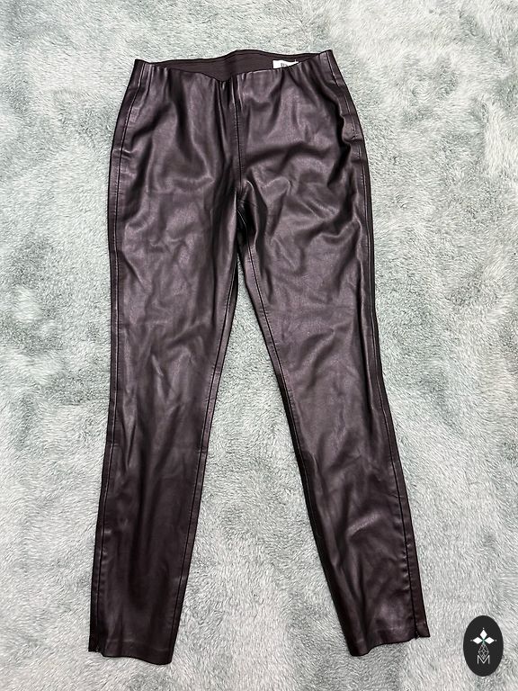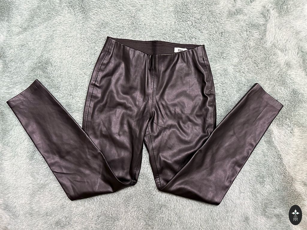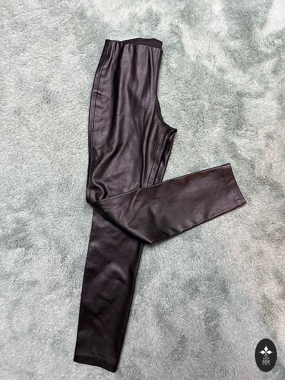 Очень эластичный материал, который выглядит как кожа, но состоит из хлопка и эластана. Дышащие! Брюки надевались несколько раз, в отличном состоянии. Качественный материал, который долго не рвется ни при ношении, ни при стирке. Размер 40: