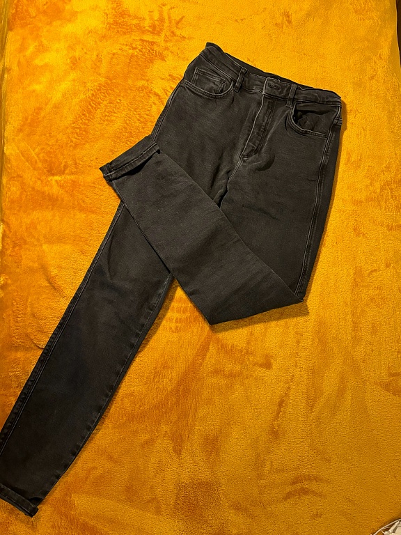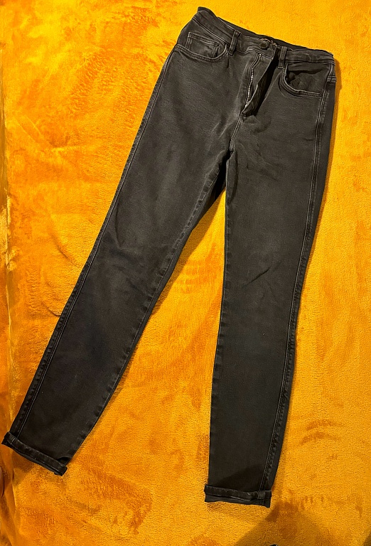 Praktiškai nauji, šviesiai mėlyni džinsai. Kelnės dėvėtos 1 kartą, klubai apie 80 cm, o liemuo 66 cm.