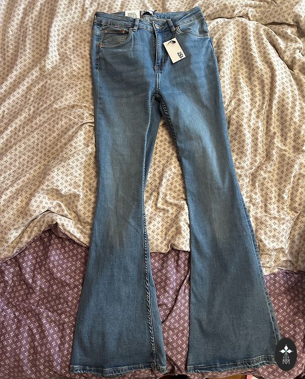 Suurus 38, kõrge vöökoht, lai lõige Vöökoht 39 cm x 2 Puusad 53 cm x 2 Pikkus 109 cm Sobib ideaalselt suurusele M. Hind ei sisalda saatmiskulusid.