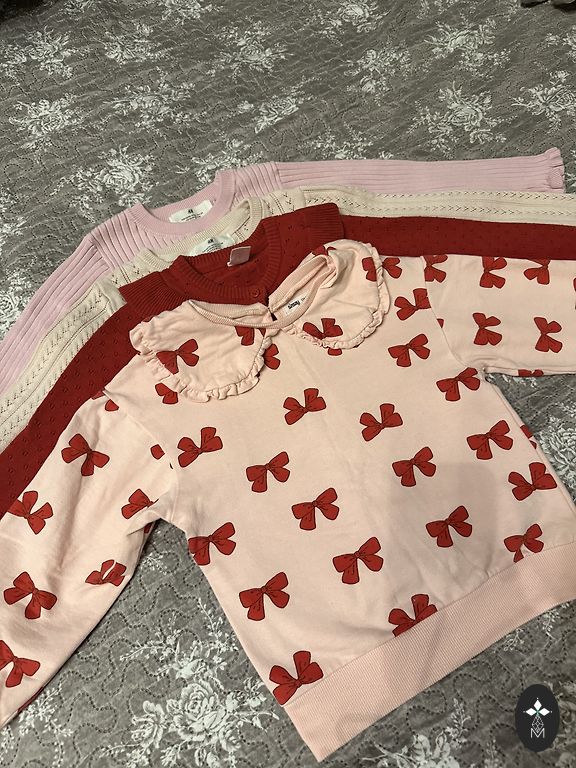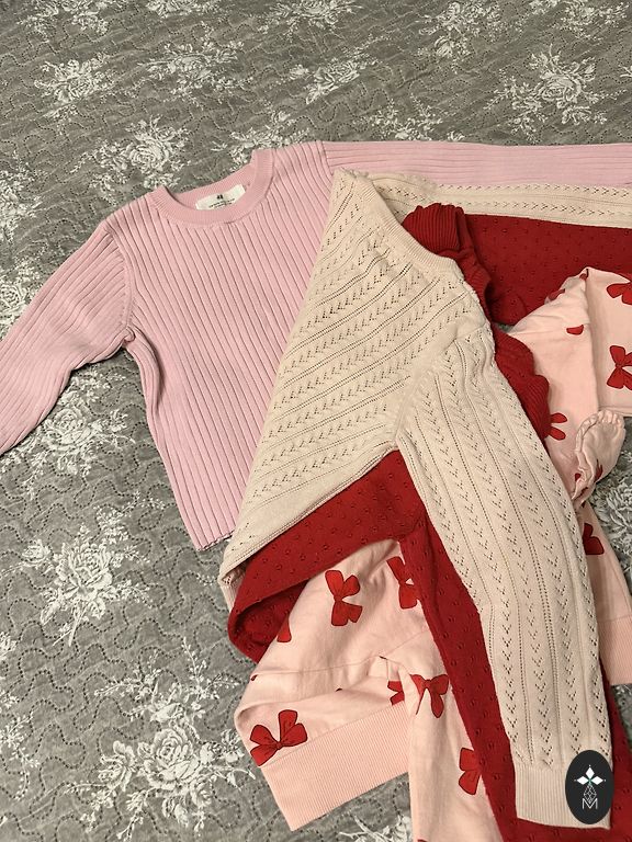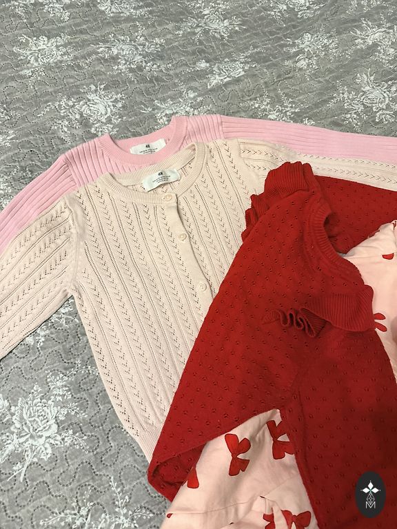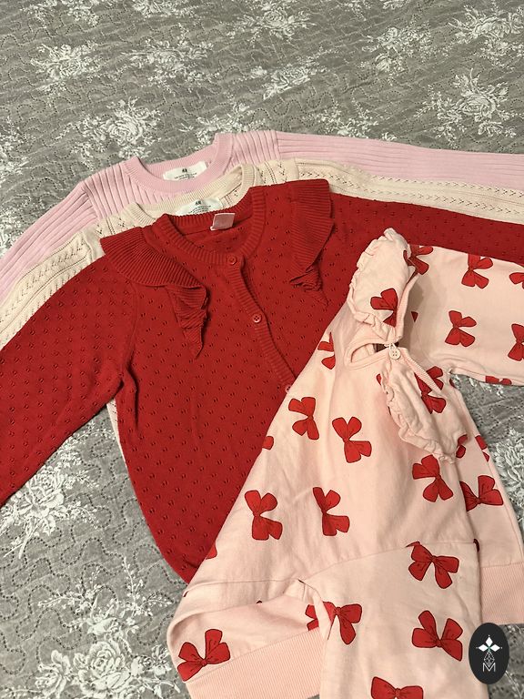 Ir komplekte dar 2 nauji nenešioti raudoni megztiniai su širdelėmis, vienas 62 dydis, kitas 68, bet skiriasi tik nedideliu gabalėliu.