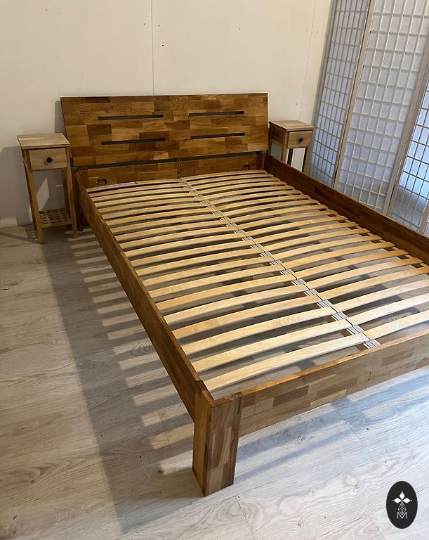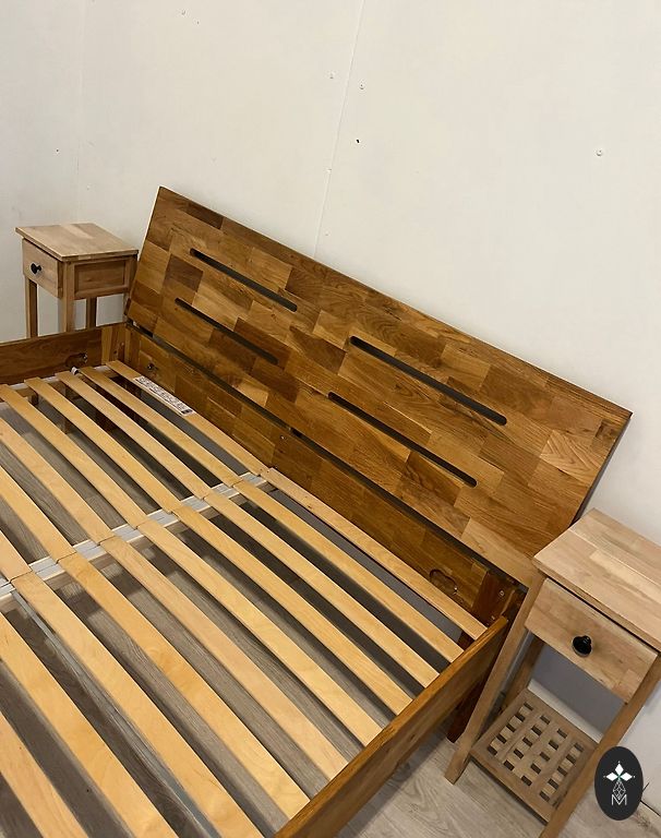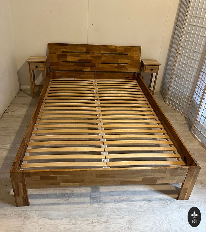 Naudotas, geros būklės (reikėtų tik perdažyti vairą). Pagaminta Ispanijoje (pagal užsakymą), Casanova Gandia prekės ženklas. Osis, bambukas, odos detalės. Kokybiški, masyvo medžio baldai, kurie tarnaus dar daugelį metų. Lova 210x230x130, naktiniai staleliai 50x40x51, čiužinys Dormeo Air+Comfort 180x200.