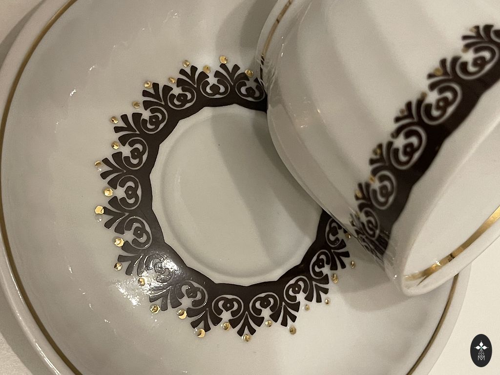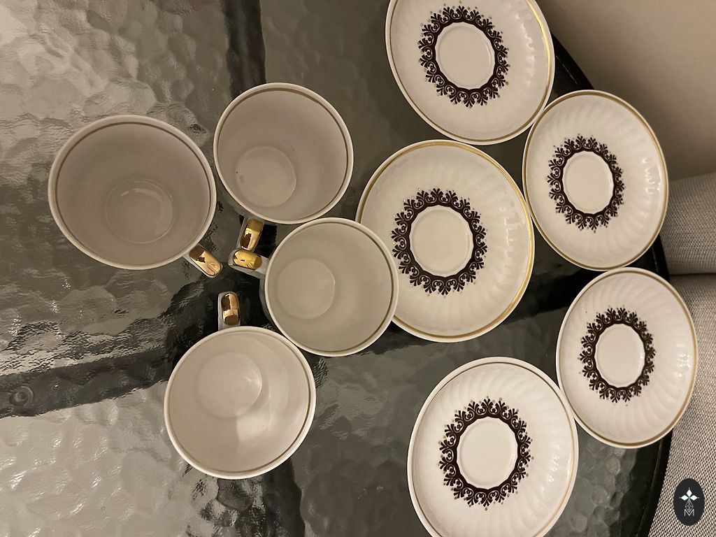 Coffee trio from the Marianna tableware set with lilac flowers, cup, saucer, and cake plate. Various stamps. Excellent condition.