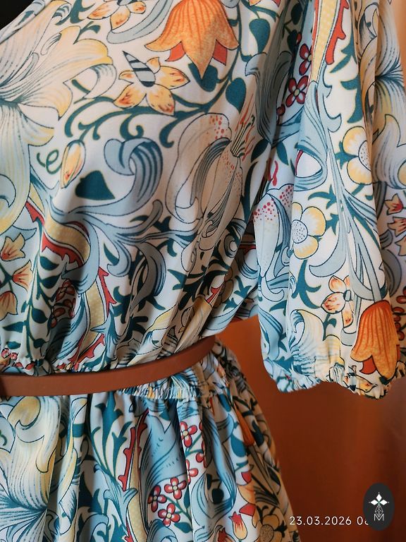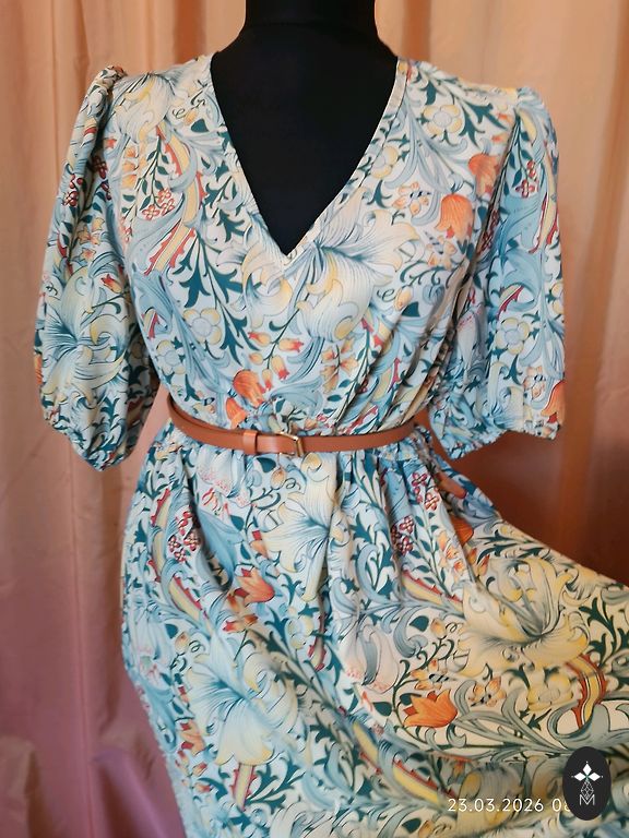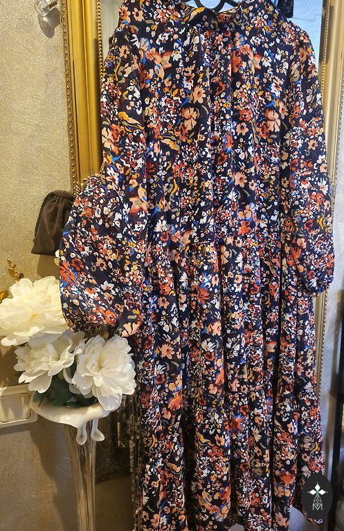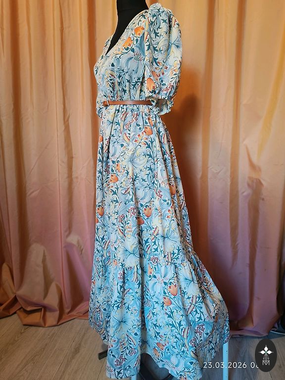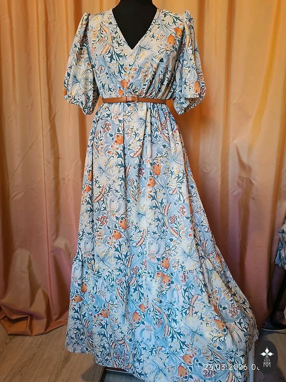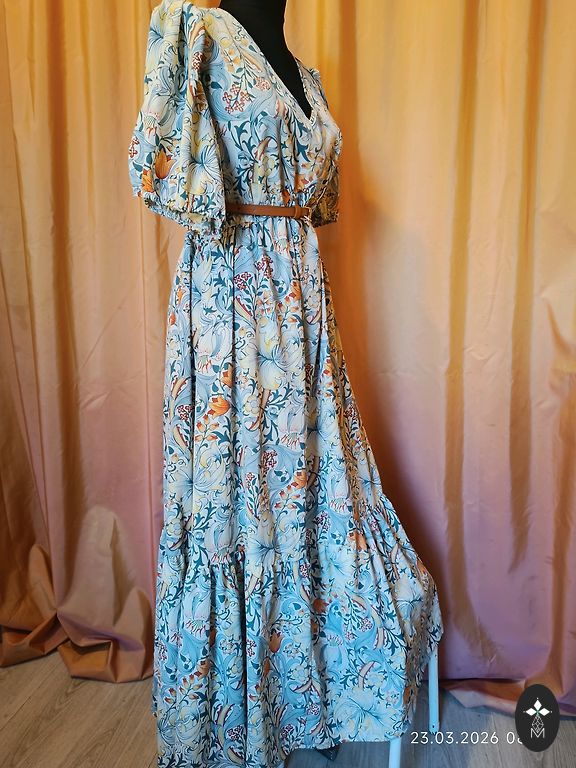Грудь 110 см, талия 84-104 см, к низу расширяется, длина 95 см, с подкладкой