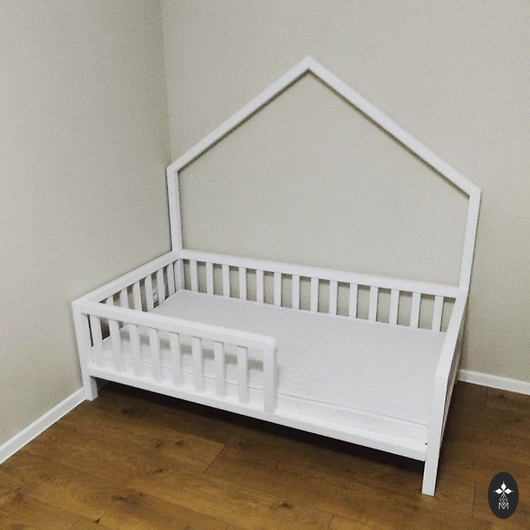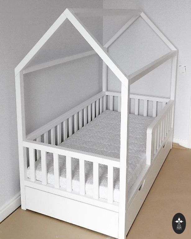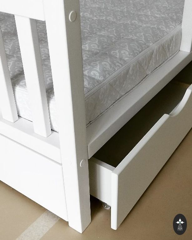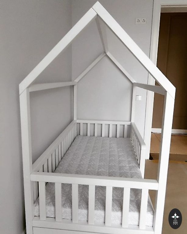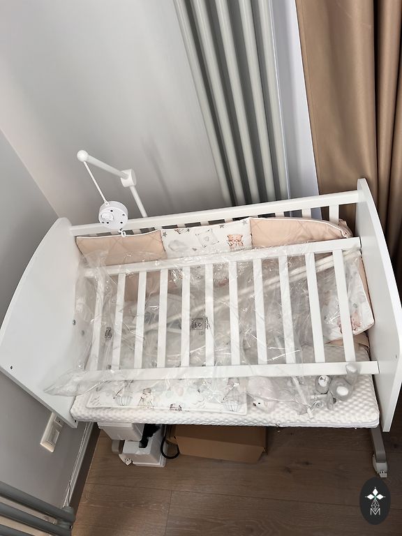 Restaurēts koka bērnu šūpulis ar rokdarbu ementiem. Maigs, pelēcīgs lavandas tonis ar baltu iekšpusi, ekoloģiska krīta krāsa. Sānu paneļi rotāti ar ziedu un augu motīviem, trafaretu tehnika. Rakstā redzami arī putni.