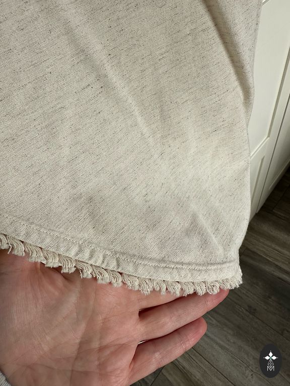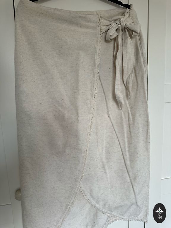Žavinga 100 % lino sijonas, praktiškai naujas, dėvėtas vieną kartą. Jis turi kišenes, gražiai pasiūtas, užtrauktuką ir skeltuką gale. Juosmuo aplink vidurį Juosmuo – 48 cm (96 cm) Klubai – 59 (118 cm)