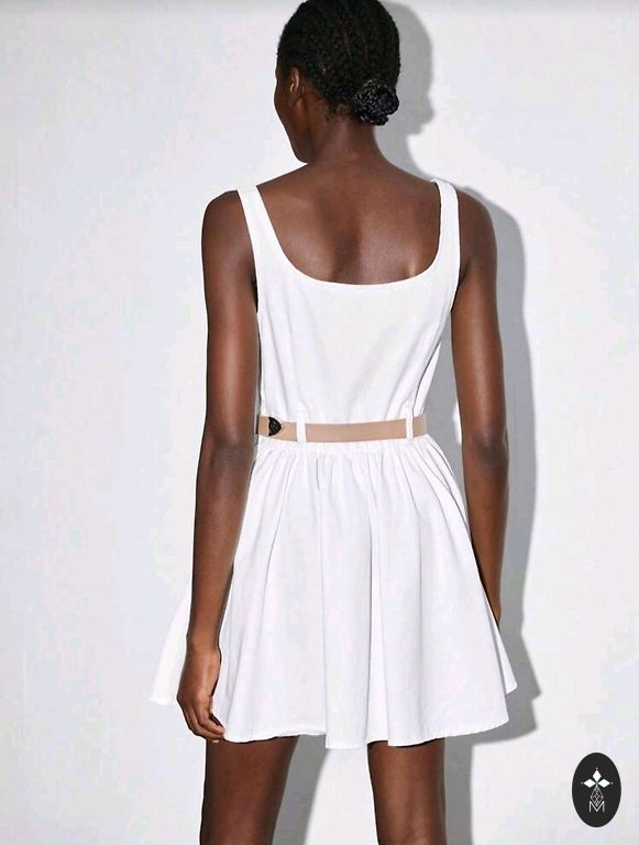Uus kleit, koos hinnasildiga, suurus kirjutatud L, kuid sobib rohkem M-le, talje 40 cm, rinnaümbermõõt 45 cm. Kleidi pikkus õlgadest kleidi alumise ääreni 82 cm.