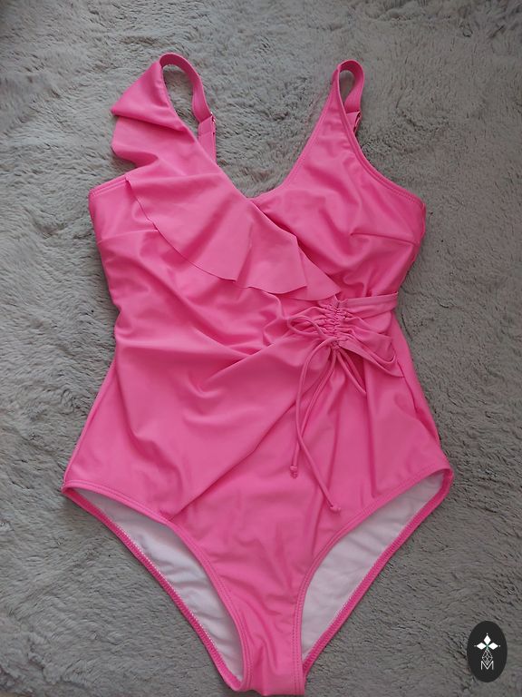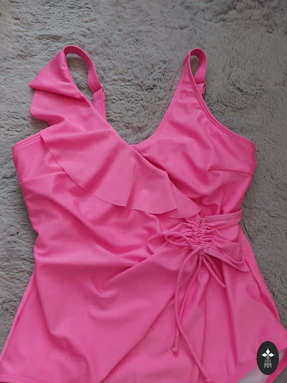 Raudonas maudymosi kostiumėlis su rožėmis.