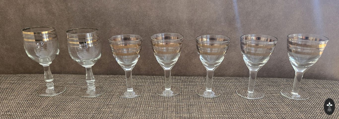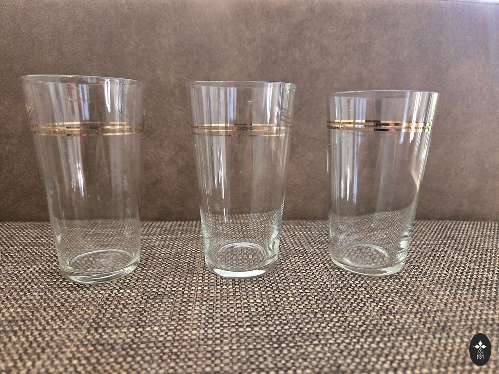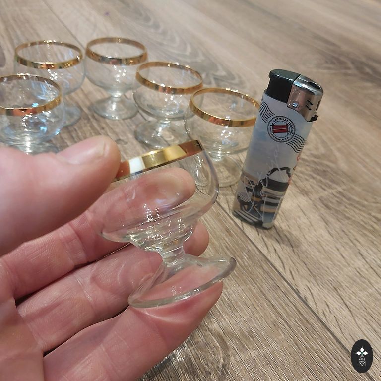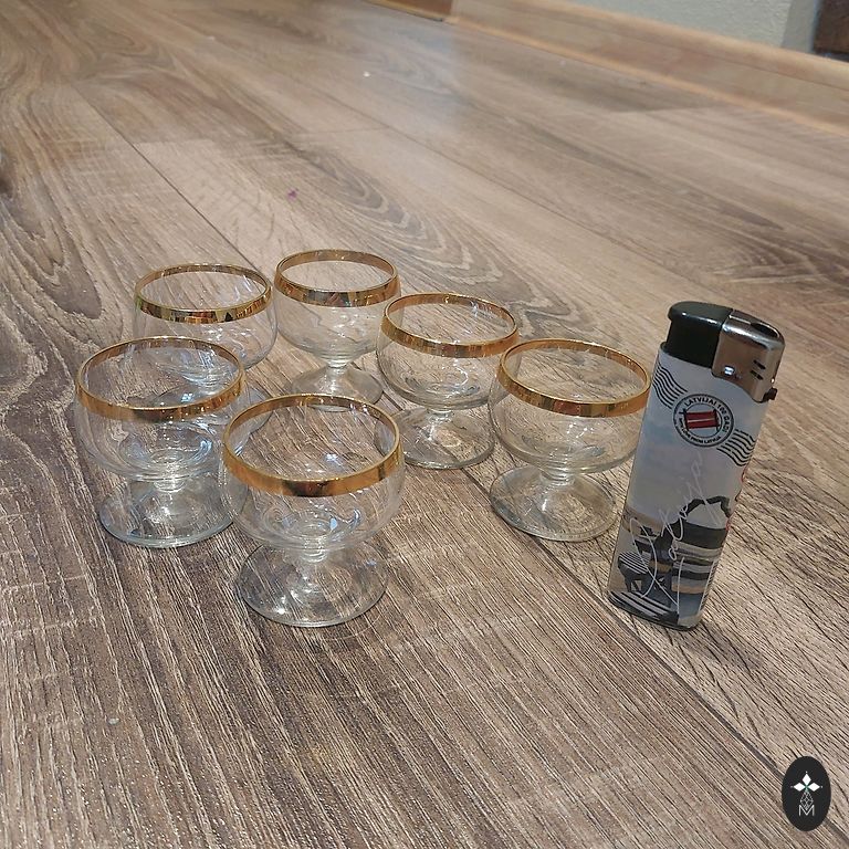 6 stiklinės. 100 ml. Pagamintos iš storio stiklo, su nedideliu aukso praradimu.