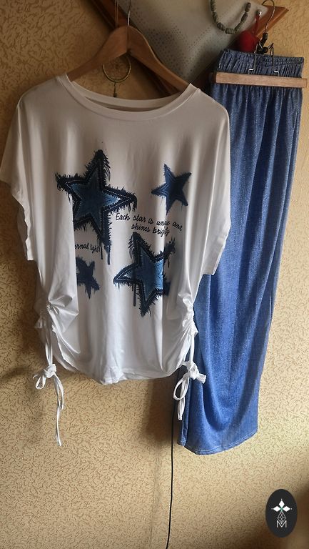 Marškinėliai krūtinėje 78x2, apačioje siauresni 71x2. Ilgis 76 cm. Sijonai guma juostoje neištempus 38x2, max 51x2. Ilgis su nėriniu kartu 93 cm. Sudėtis matoma vienoje iš nuotraukų. Lengvas, raukšlėtas. Naujas.