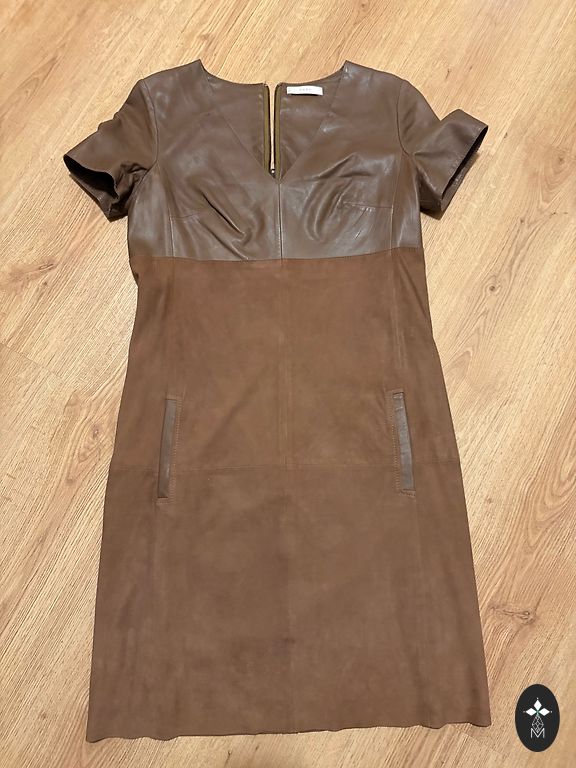 Jauna itāļu kleita. Kvalitatīva. Man nepiemērota garuma. Elastīga josta. Garums no pleca 85 cm. Krūšu apkārtmērs 48 (96). Garums no pleca līdz piedurknes galam 63 cm. Elastīgas aproces. Viegla.