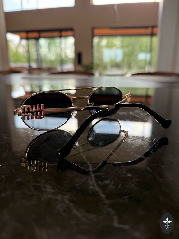 Frameless glossy sunglasses with Ombre tint, complete with a gold-plated chain and white leather case