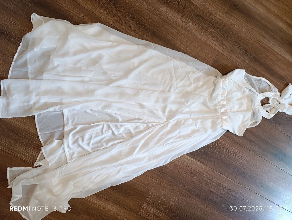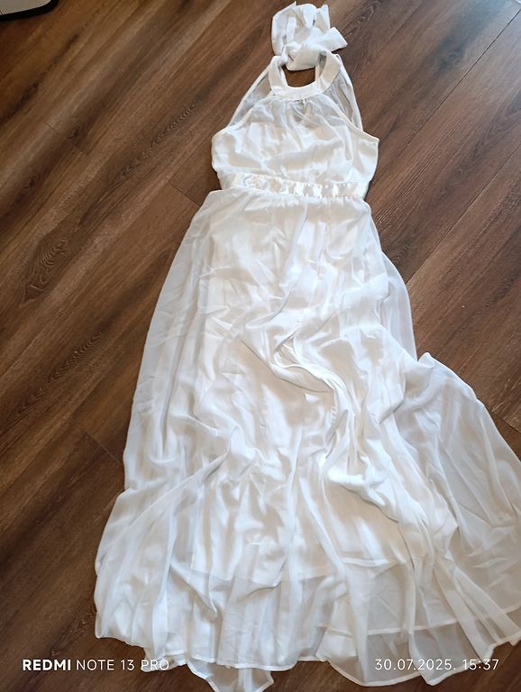 Kleit on uus, suurus 42-46, rinnaalune ümbermõõt 100, kleidi pikkus 140. On väike defekt, tõmblukul on lukk katki.