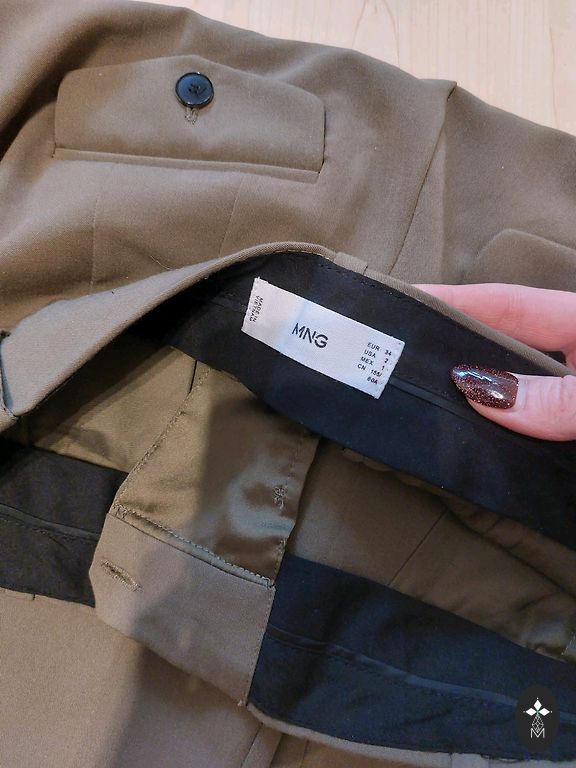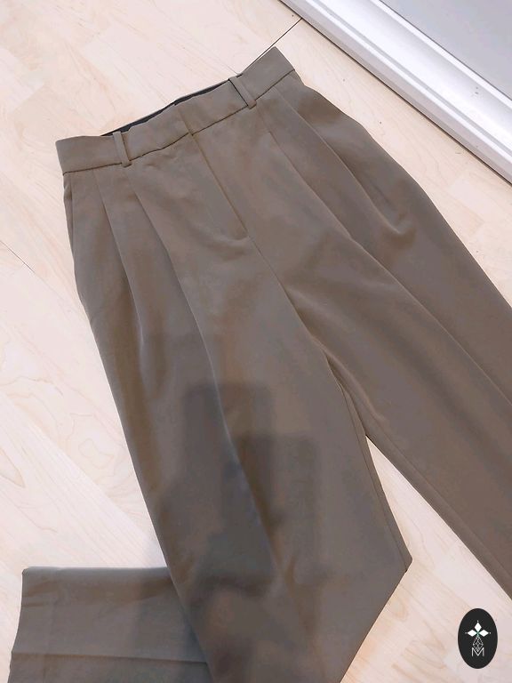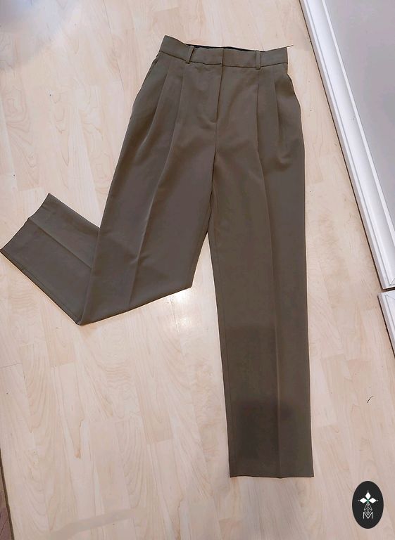 Chaki spalvos kelnės, juosmens su guma ir audinio dirželiu, ilgis 95.