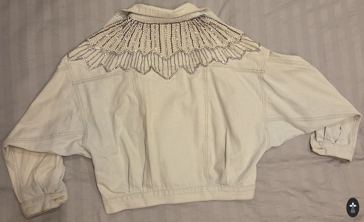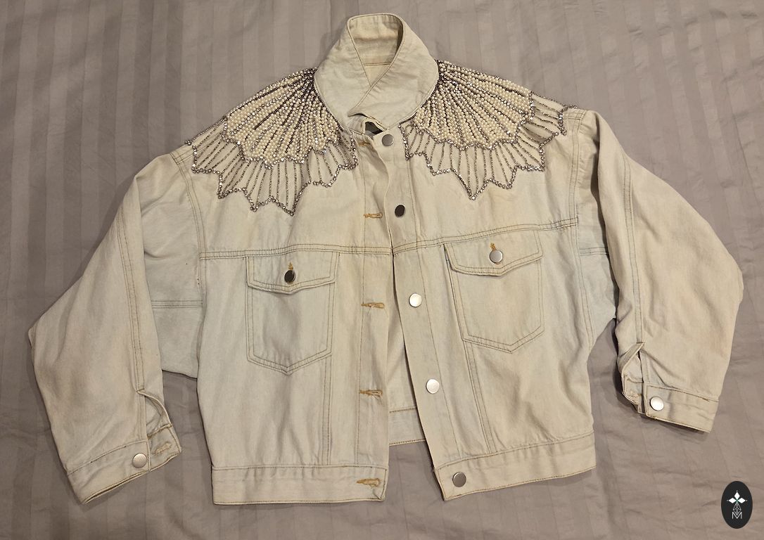 Zilas krāsas, džinsa auduma krekls ar apkaklīti un spiedpodziņu aizdari, kreklam ir mežģīnes ielaidums rokās.