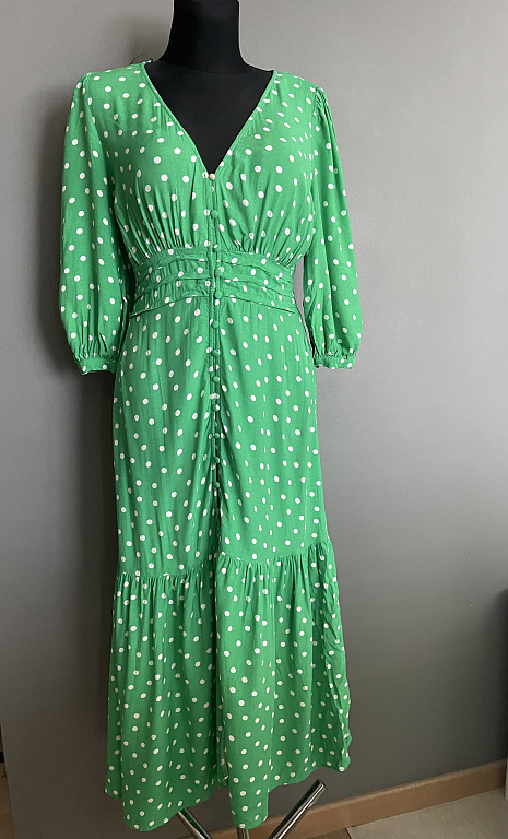 Nuostabi medvilninė suknelė iš Sasha Ferano. Suknelės ilgis 123 cm, krūtinės ir liemens 120 cm, klubai 140 cm, rankovių ilgis 57 cm, plotis 40 cm. Užsegama, yra kišenės, apykaklė, diržas. Šonuose gilūs skeltukai. Labai maloni ant kūno, nes medvilnė. Komplimentai garantuoti!