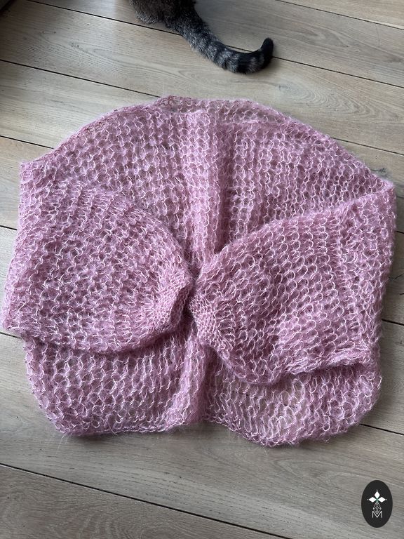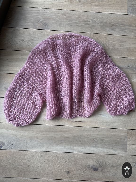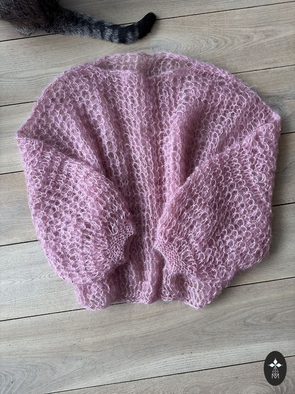Knitted with 2.5 mm needles from cotton/linen/silk yarn, in a beautiful greenish-gray color with an asymmetric pink sleeve. Suitable for M/L.