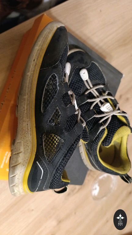 Ir nobružājušies purngali un vienai aizmugurē skrāpējums,kas netraucē valkāšanai. Nav nekur saplīsis.