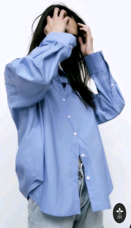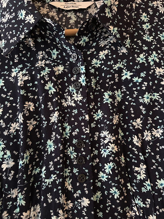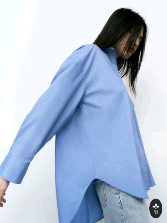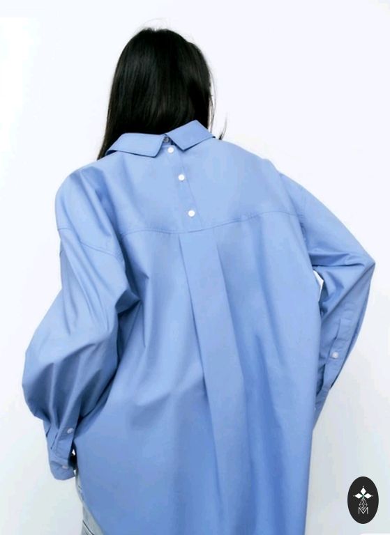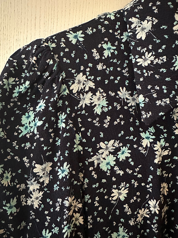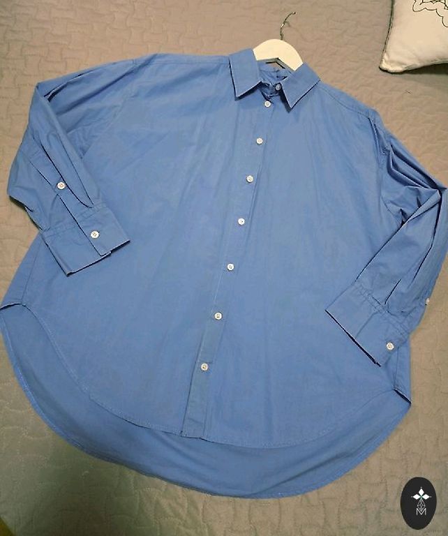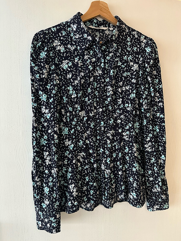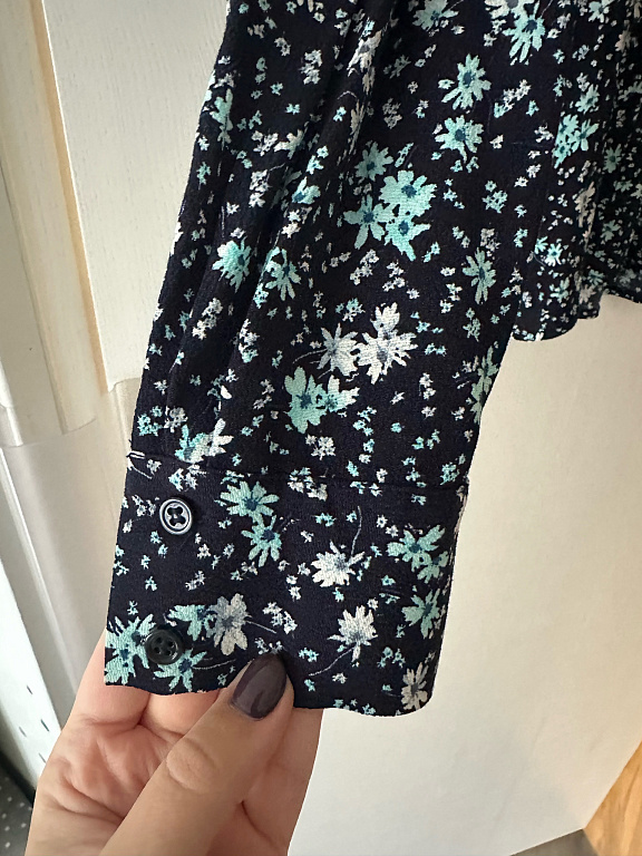 Elegantne puuvillane pluus, vöökohas seotav, kangasmuster, siniste täppidega, ilus, rinnaümbermõõt 96 cm, õlgade laius 38 cm, pikkus 66 cm, varrukate pikkus 45 cm + saatmine.
