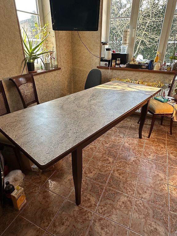 Parduodu sulankstomą, mobilų stalą ant siuvimo mašinos kojų iš 18 mm faneruotos (ąžuolo) faneros. Sulankstyto stalo matmenys yra 700mm x 470mm, išskleisto 1000mm x 600mm, aukštis 780mm.