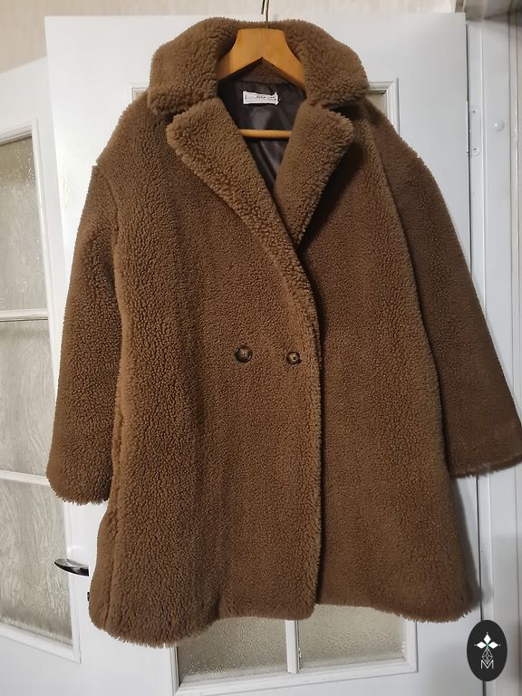 Mētelis rudens - ziemas, ar kapuci, rāvējslēdzi un pagām, pleci 55, roka reglāns 60, krūtīs 120, viduklis 120 ir savelkāms no iekšpuses, garums 100 cm.