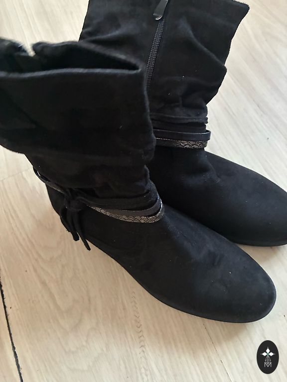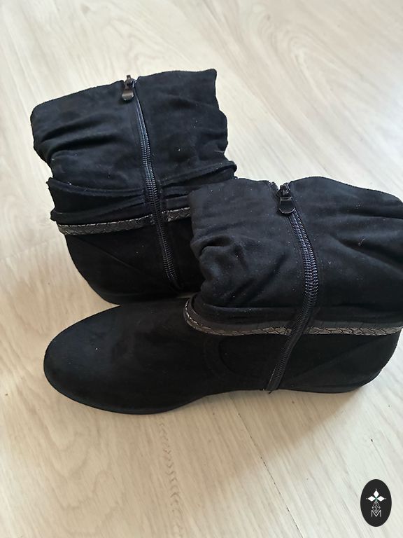 Mākslīgās zamšādas zābaki.Sudraba krāsas akcenti sānos. Pāris reizes uzvilkti, tomēr man par lielu. Stabili, ērti.
