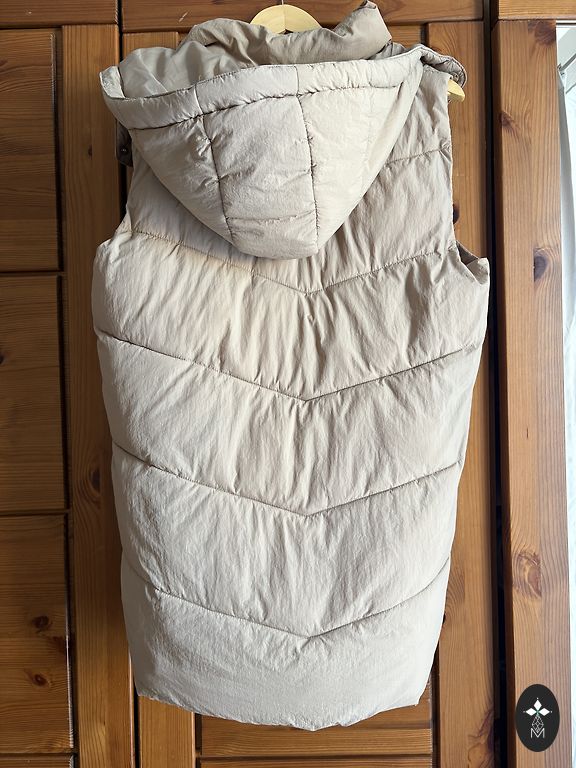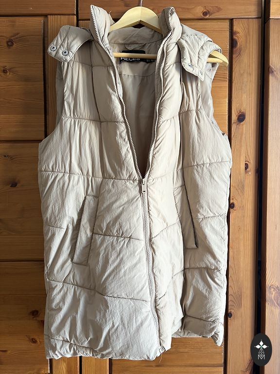 Серый жилет с карманами по бокам. У портнихи вшиты специальные застежки, чтобы жилет можно было закрыть. Внутри местами есть пятна на подкладке, которые, скорее всего, можно очистить. Внешняя сторона в отличном состоянии.