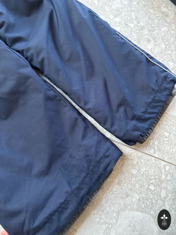 Used winter pants. The knees are worn, but this indicates that the pants were useful and will certainly experience many more joyful winter moments. There is a small tear of 1cm on the fabric surface of the right knee.