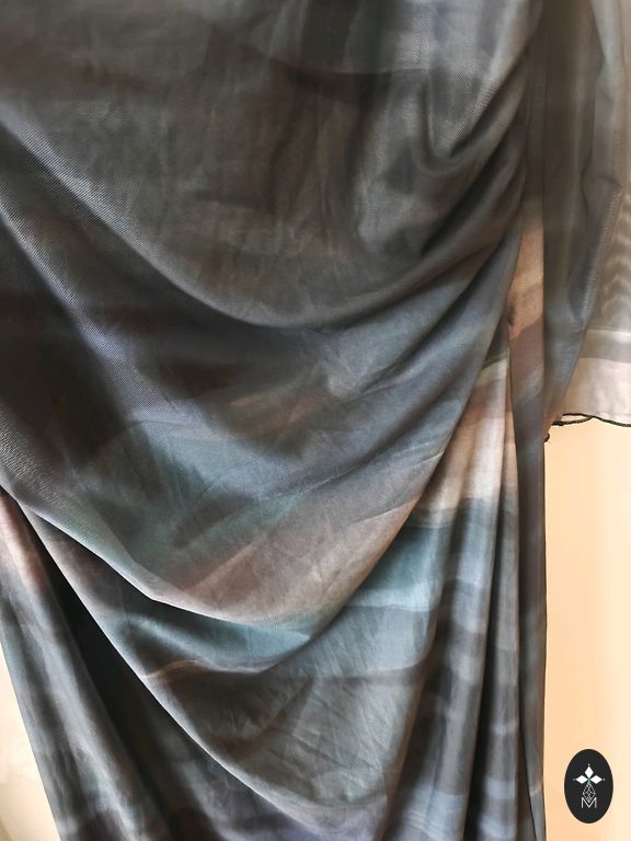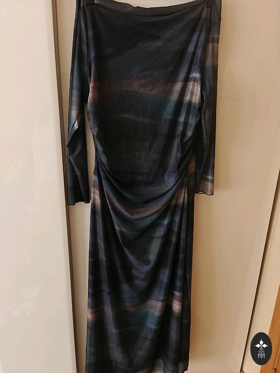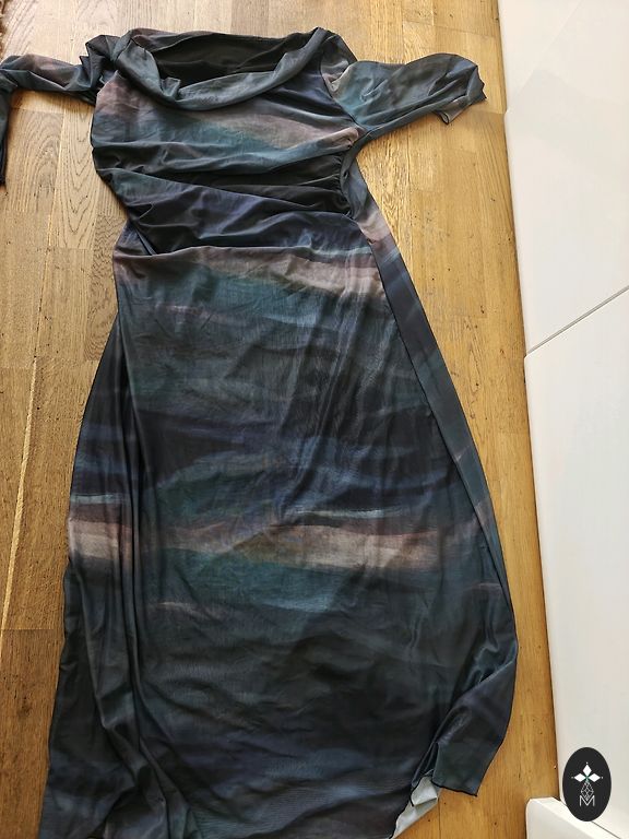 Pārdodu tumši zilu šifona svētku tērpu - komplektu. Kleita bez piedurknēm, ar oderi, aizmugurē rāvējslēdzējs, uz leju paplatināta, rotāta ar gliteriem. Komplektā tāda paša auduma šifona žaketīte ar 3/4 piedurknēm, bez aizdares, arī rotāta ar gliteriem. Kleitas izmēri - krūtīs 67cmx2, viduklī 60cmx2, gurnos nāk uz leju paplatinājums, kleitas garums 140cm, plecs 14 cm. Žaketes izmēri - krūtīs, viduklī, gurnos 73cmx2, piedurkne 48cm, žaketes garums 65 cm, plecs 17cm. Cena par visu komplektu kopā. Skaista kleita, labi izskatās mugurā. Izsūtu uz pakomātiem pēc Andeles cenrāža, sūtīšanu sedz pircējs, klātienē netiekos, pretenzijas neuzklausu.