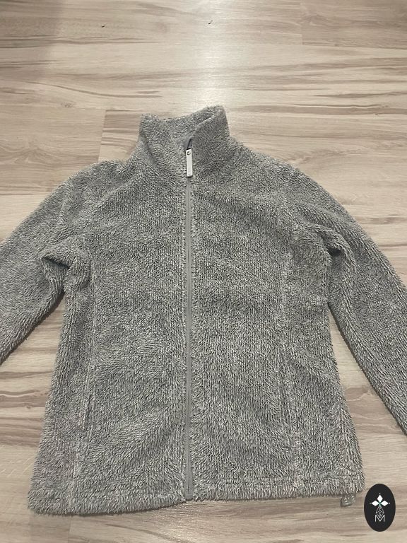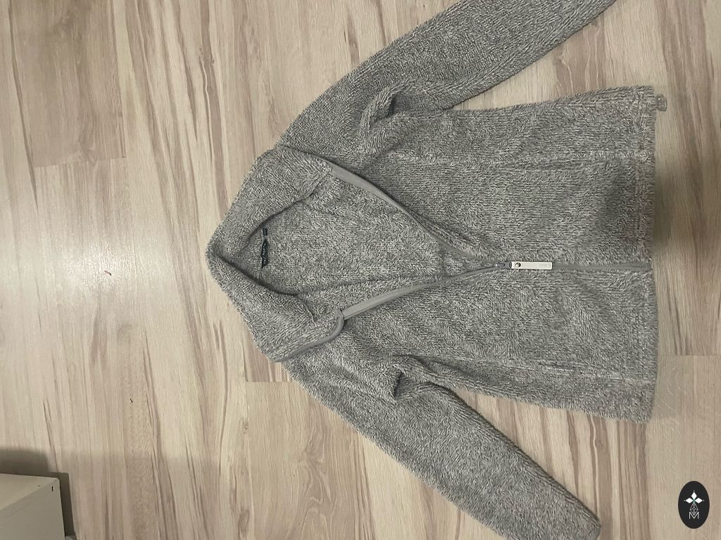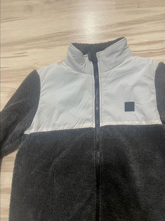 Denim jacket with bleaching and small rips. Wool lining. Not too long.