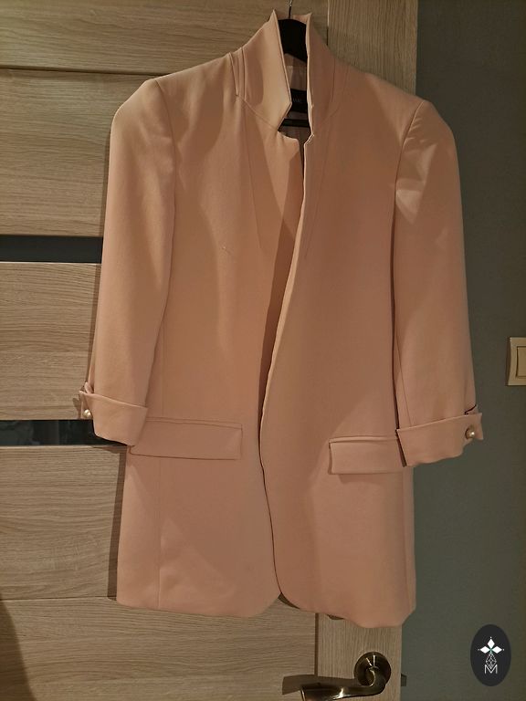 Nuotrauka nematoma, bet striukė yra šviesiai rožinė. Kišenės nėra atviros, yra didelis užsegimas su sagomis, o rankogaliai gali būti sulankstyti. Puikios kokybės apdaila ir pamušalas. Tinka S dydžiui, pečių plotis 41 cm, ilgis 71 cm, rankovių ilgis 49 (7) cm, pažastų plotis 45 cm, plotis ties juodu apvadu – klubų plotis 96 cm. Kaina + pristatymas
