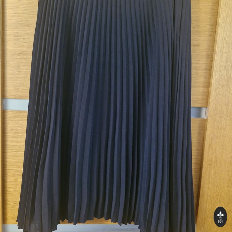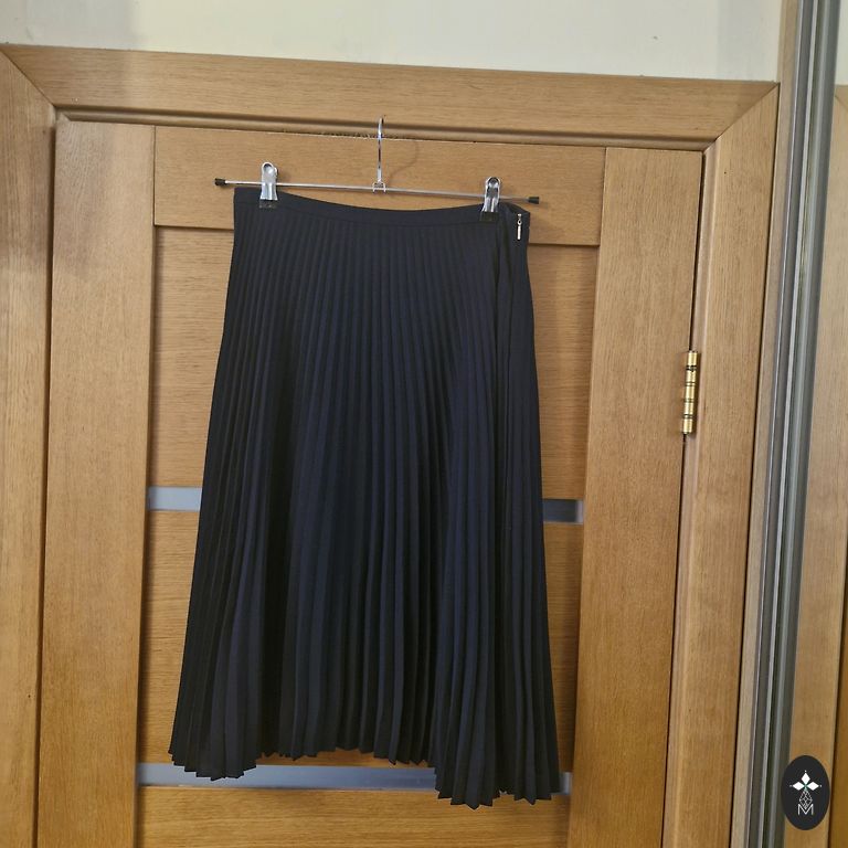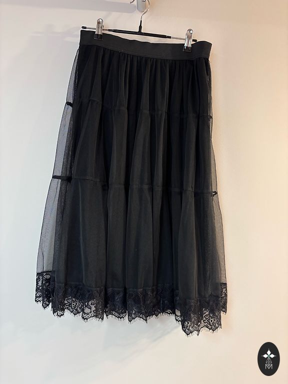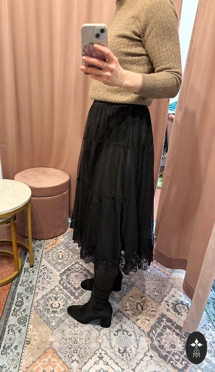 Ширина 38 см, длина 52 см. Юбка с подкладкой из тилла для дополнительного объема. Имеет боковые карманы, золотистый металлический замок-молнию и эластичный пояс сзади.